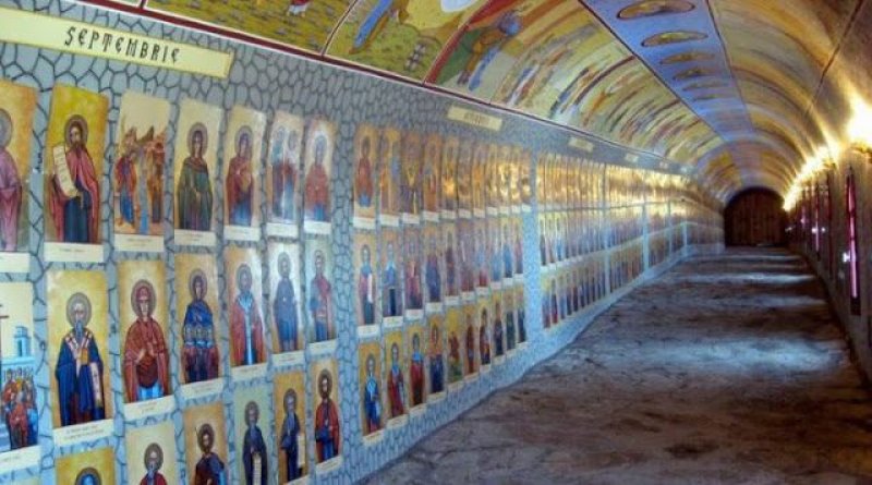 Calendarul începe cu luna septembrie, respectând astfel regulile ortodoxiei, şi este pictat pe partea stângă a tunelului. Pentru fiecare zi din an a fost ales câte un sfânt preluat din calendarul ortodox. Data din calendar este marcată cu o candelă care arde în permanenţă la baza picturii care marchează acel moment din an. După o zi, candela aprinsă este mutată la următorul sfânt din calendar.